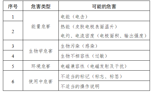 表2依据YY/T 0316—2016的附录E(表E.1)列举了中频电疗产品有关的可能危害示例的不完全清单,以帮助判定与中频电疗治疗产品有关的危害。企业还应根据自身产品特点确定其他可能危害。针对产品的各项风险,企业应采取控制措施,确保风险降到可接受的程度。